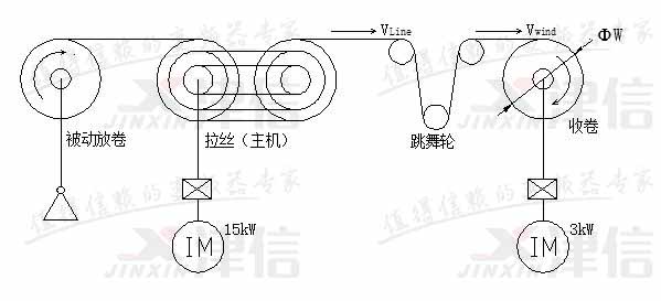 水箱拉絲機是子午線輪胎用鋼簾線生產企業的關鍵設備,其收卷控制是變頻器跳舞輪位置反饋控制。由于生產速度快,用量大,加上環境比較惡劣,因此要求采用性能優異,穩定性好,質量可靠和抗腐蝕能力強的變頻器。我廠為拉拔0.22毫米以下線徑的鋼簾線定制了160型新型水箱拉絲機上,全部選用了丹佛斯最新推出的FC系列變頻器作收卷和主傳動驅動,取得了很好的運行效果。