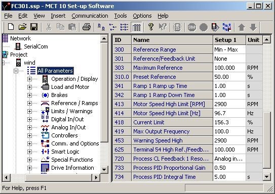 圖六為MCT10軟件顯示的FC301變頻器的參數設置(部分)。