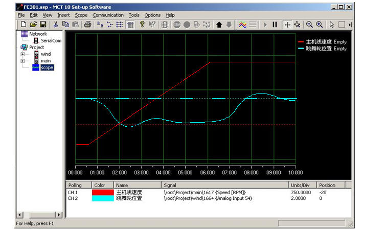 卷繞控制的特點:同樣的一套PID調節參數,勻速時易于穩定,波動也較小;而加速時就不易于穩定,而且因為跳舞輪位置有靜差,波動幅度也較大。因此PID調節參數主要針對加減速過程予以優化。MCT軟件有數字示波器功能,通過實時觀測線速度和跳舞輪位置在加減速時的變化曲線,能很方便地調整調節參數。