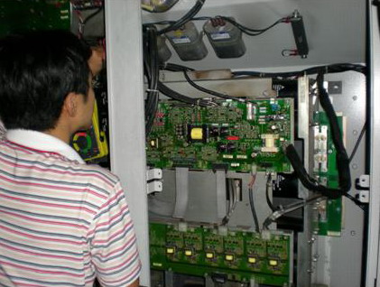 首先打開頂部風(fēng)機蓋板,取出頂部4個散熱風(fēng)機,露出散熱片,用空壓氣體清理散片。將散熱片清理干凈后,更換兩個損壞的風(fēng)機 同時將剩下的兩個散熱風(fēng)機也清理干凈。安裝好風(fēng)機后,蓋好風(fēng)機蓋板。將好的SOFTCHARGE CARD 、GATEDRIVE CARD安裝好,換上新的快速熔斷器和POWER CARD。最后將CONTROL CARD裝好。變頻器安裝完畢。再次檢查變頻器的各個部分器件好壞,檢查變頻器的外圍線路,確認(rèn)滿足變頻器送電條件。給變頻器送電,發(fā)現(xiàn)變頻器散熱風(fēng)機運行正常,開機輸出電壓平衡,帶負(fù)載運行正常。變頻器成功修復(fù)。
