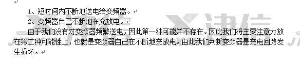 更換變頻器充電卡,依次安裝好變頻器的電源卡,控制卡,操作面板及上蓋板等。檢查變頻器的二極管特性及對地絕緣,符合送電的標(biāo)準(zhǔn)。將變頻器送電,自檢通過后,測量輸入側(cè)電源電壓,輸入變頻器參數(shù),開機輸出電壓平衡。帶負載測量輸入和輸出電流平衡,變頻器修復(fù)。