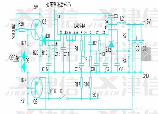 Ø 測(cè)試芯片L4974A 輸出電壓15V為0V,查芯片8腳軟啟動(dòng)電壓是0.5V,正常值為3.85V,所以芯片L4974A的8腳輸入電壓不對(duì)。經(jīng)查Q2輸入觸發(fā)電壓正常。