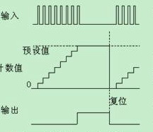 計數(shù)器的工作時序圖如圖二,當產(chǎn)品數(shù)量計數(shù)到達預(yù)設(shè)值時,計數(shù)器數(shù)字量輸出信號動作,中止主機運行。等用戶將計數(shù)器復(fù)位以后,主機又可以再次運行。