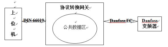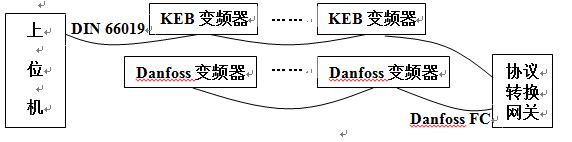 為了節(jié)省投資,變頻器替換采取逐步進(jìn)行方式,即損壞一臺(tái)KEB變頻器,替換一臺(tái)。也就是說系統(tǒng)中將同時(shí)存在兩種變頻器和兩種協(xié)議。現(xiàn)在要開發(fā)的通訊協(xié)議轉(zhuǎn)換網(wǎng)關(guān)就是要使其對(duì)上位機(jī)而言,丹佛斯依然被視作DIN 66019協(xié)議的數(shù)據(jù)設(shè)備;而對(duì)于Danfoss變頻器而言,還是在Danfoss FC協(xié)議控制下工作。此外,根據(jù)功能需求分析,該協(xié)議轉(zhuǎn)換網(wǎng)關(guān)需要具有伸縮性,即增加Danfoss變頻器時(shí),需要將新增加的Danfoss變頻器包裝成DIN 66019協(xié)議下的設(shè)備,而不管丹佛斯變頻器的數(shù)量多少,在上位機(jī)看來,它們應(yīng)該是DIN 66019協(xié)議下的與原KEB變頻器沒有任何沖突的設(shè)備。兩種協(xié)議并存的結(jié)構(gòu)框圖如圖2所示。