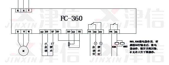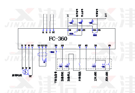 此應(yīng)用事例中,放線架配置了升降臺,用于裝載和卸下放卷盤,升降臺只允許在放卷停機時進(jìn)行操作。為避免在運行過程中誤操作升降臺,使用FC360的繼電器2在運行時輸出一個信號給控制升降臺回路中的繼電器,放卷運行時斷開升降控制回路,從而保證升降機不被啟動。