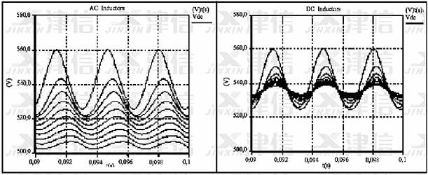 圖6中顯示的是加裝交流和直流電抗器對直流整流電壓的影響。從測量結果可以清晰看出加裝交流電抗器雖然對直流電壓上的高次諧波(520VDC以上)有明顯的抑制作用,但同時會造成直流側電壓的明顯損失。而直流電抗器在濾除高次諧波的同時對于直流電壓不會造成任何電壓損失