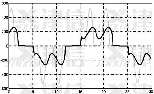 圖3是在高壓示波器上測量出的輸入側電流波形圖,在此圖上可以清晰的看出變頻器輸入側電流波形所產生的畸變。